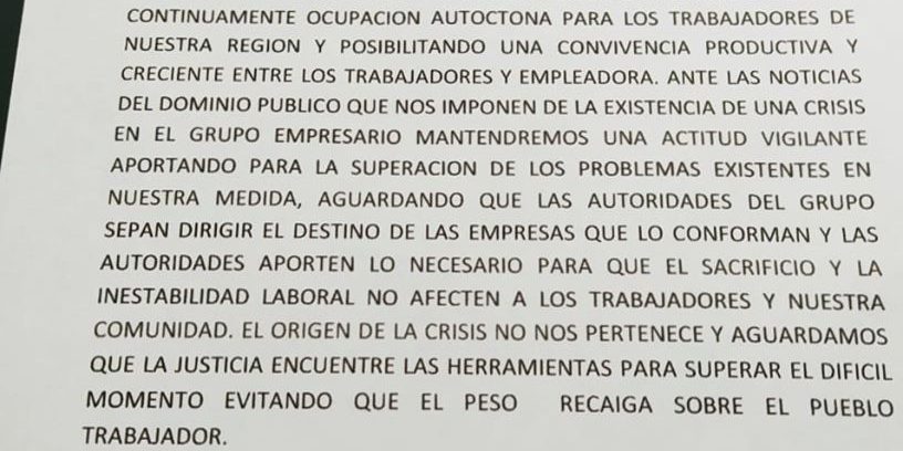 En ese marco, pedimos a las autoridades competentes garantizar la continuidad laboral de los compañeros ante la crisis que afronta la firma y que no sólo pone en riesgo el trabajo sino la subsistencia de toda la región.